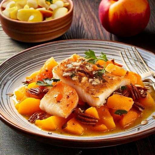 A delightful, fresh dish combining the delicate flavour of cod with a tangy and slightly nutty peach-pecan salsa.