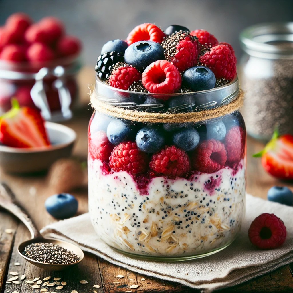 Overnight oats with berries is a nutritious, easy-to-make breakfast that’s perfect for busy mornings. Prepared the night before, these oats become soft and creamy by morning, absorbing the flavours of almond milk and honey. Topped with a colourful mix of berries, including strawberries, blueberries, and raspberries, this breakfast is not only visually appealing but also packed with antioxidants, fibre, and protein to keep you energised throughout the day. With a touch of chia seeds for added nutrients, this breakfast offers a balance of sweetness and freshness, ideal for a healthy start.