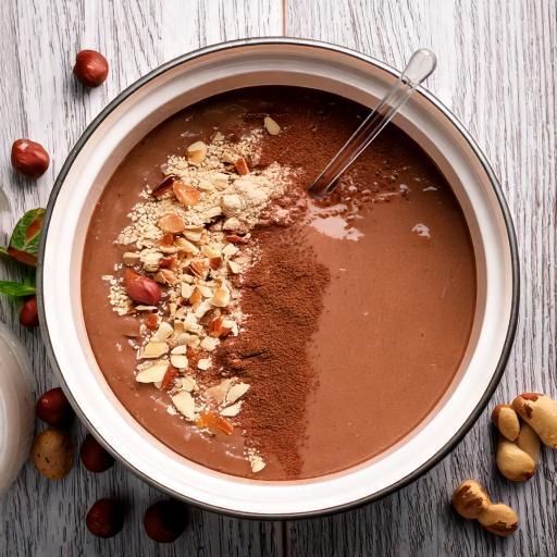 Mix the almond butter, rice drink, cocoa, protein powder, and chopped hazelnuts.